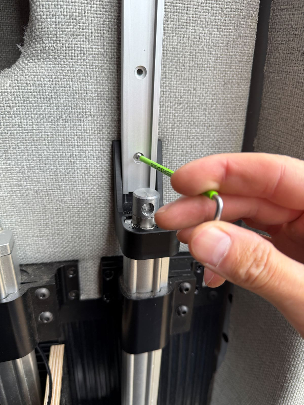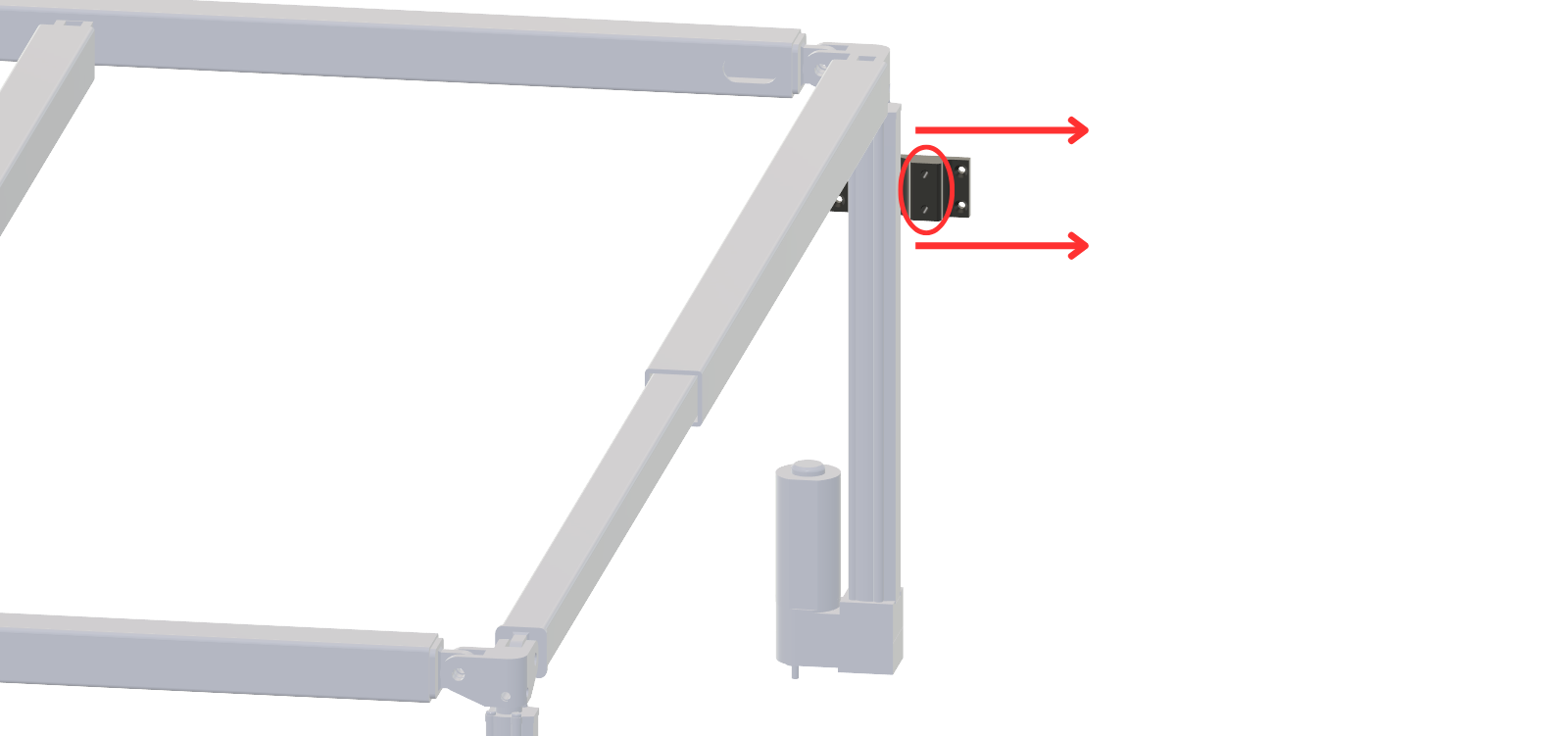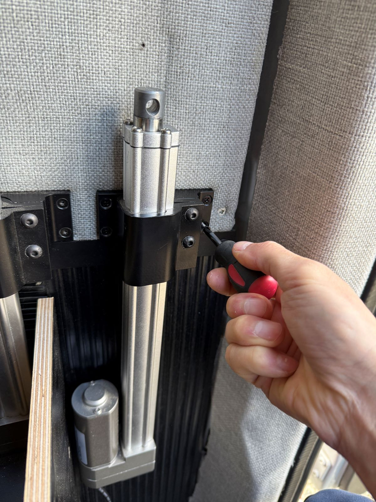 When the bed can be raised, raise the actuators with linear guides so the bi-directional joint is just below the top mounting hole. This aligns the linear guide rail with the actuator.