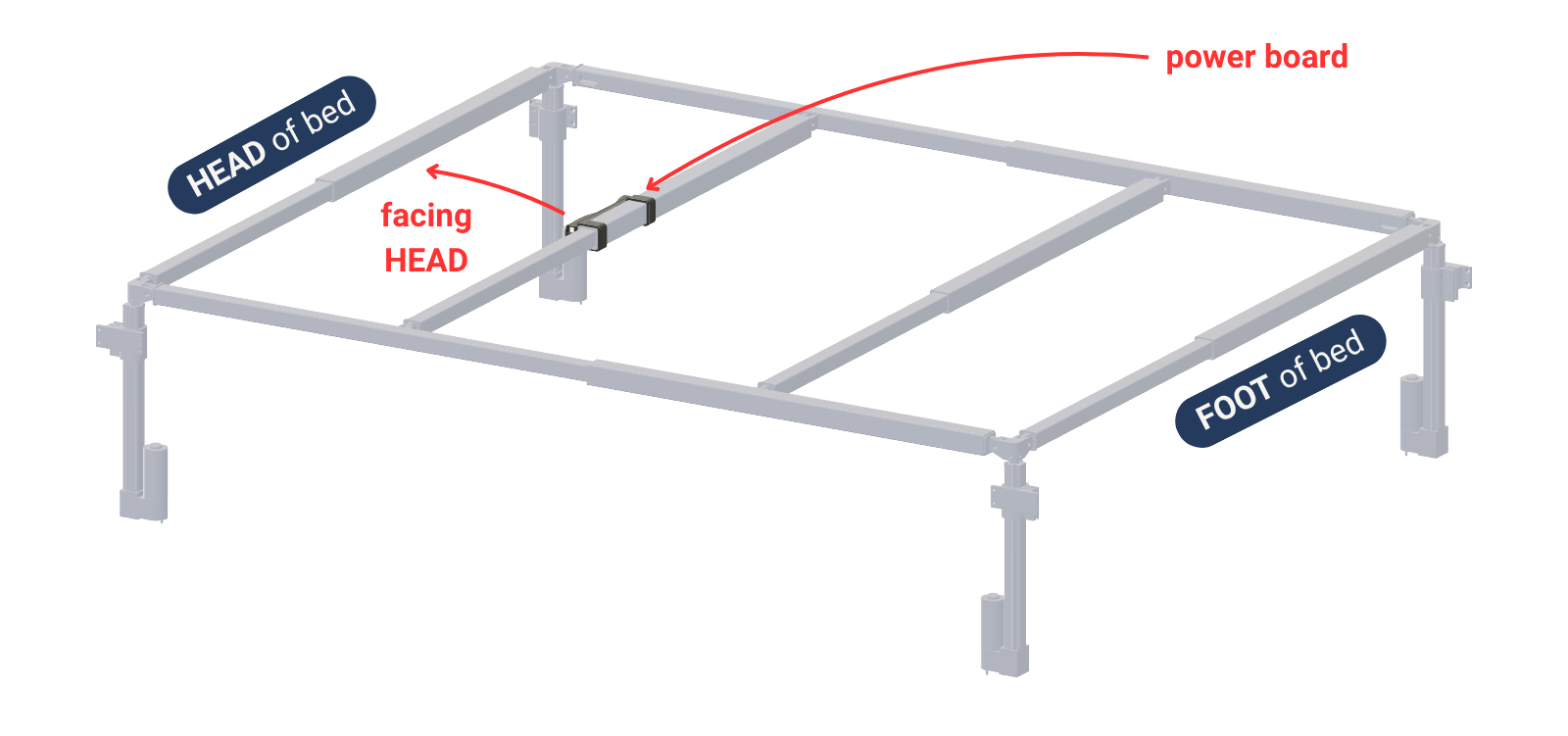 Slide the power board onto the short outer tube closest to the HEAD of the bed, with the board facing the HEAD.