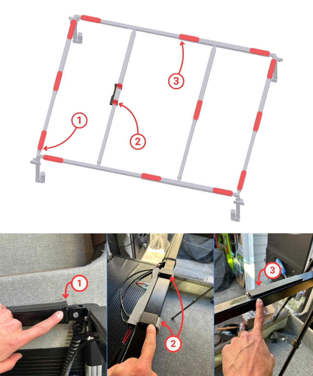 Install the adhesive-backed rubber spacers in the 14 red-marked locations. These strips prevent squeaking and protect the tubes from the wooden platform.