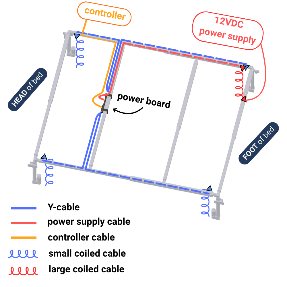 Before securing the wiring, one side of the bed needs to be raised to its maximum height to maximize the wiring distance from the power board to the actuators.