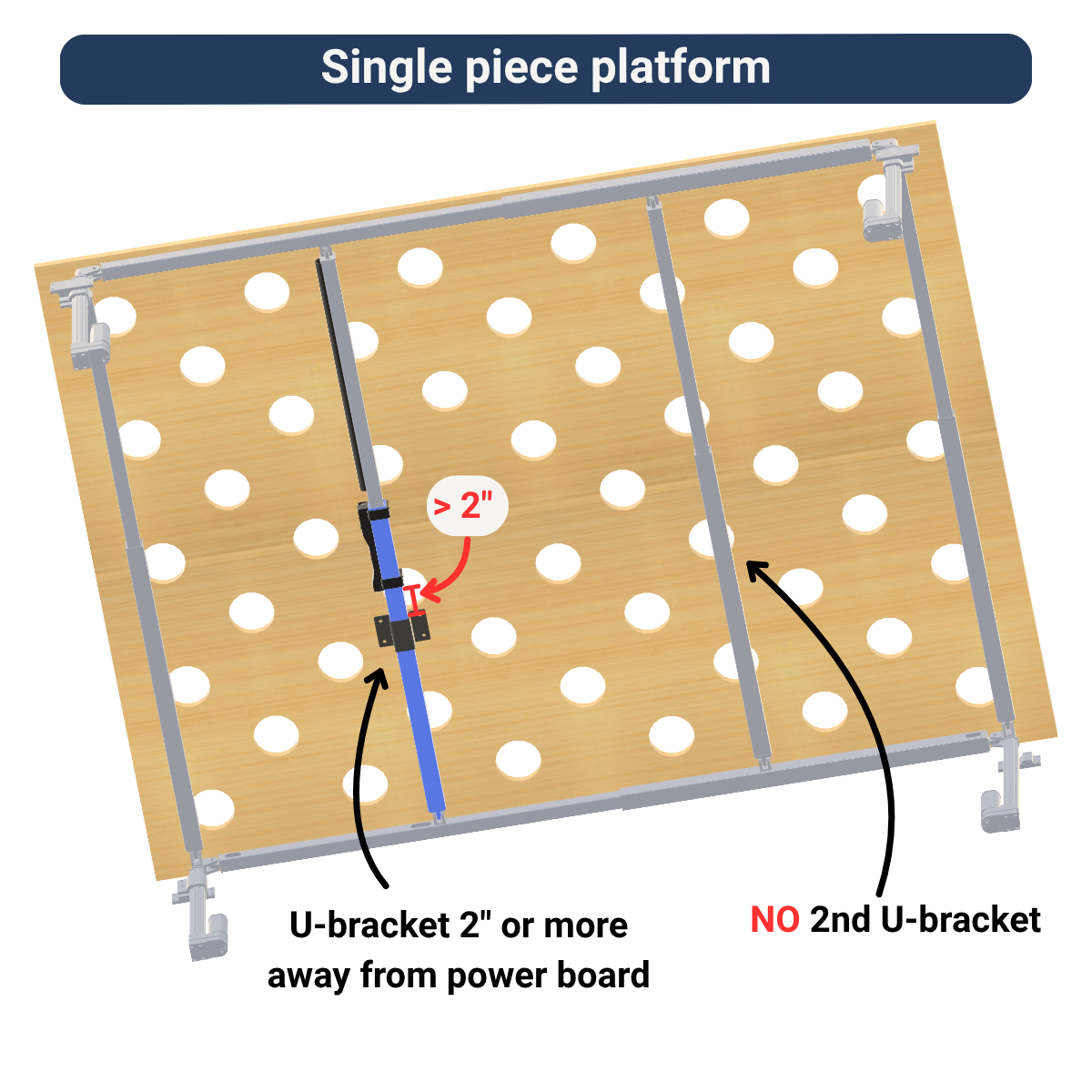 - The U-bracket nearest the power board must be at least 2″ away from the edge of the board, or wiring may be difficult to connect/disconnect.