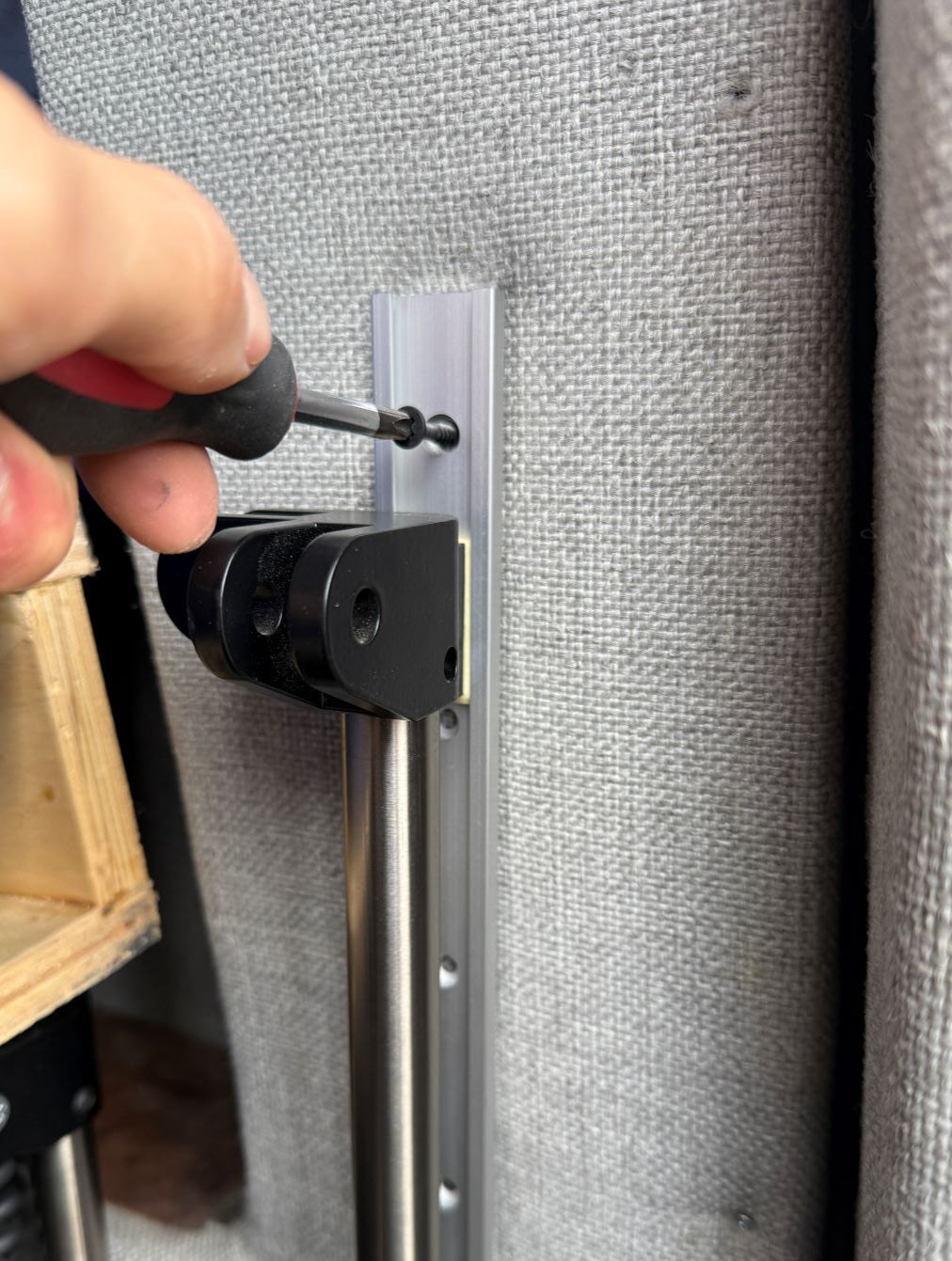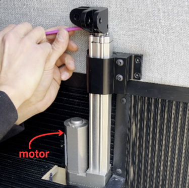Raise the actuators with linear guides so the bi-directional joint is just below the top mounting hole. This aligns the linear guide rail with the actuator. Then install a single #8 x 1" wood screw to secure in place.