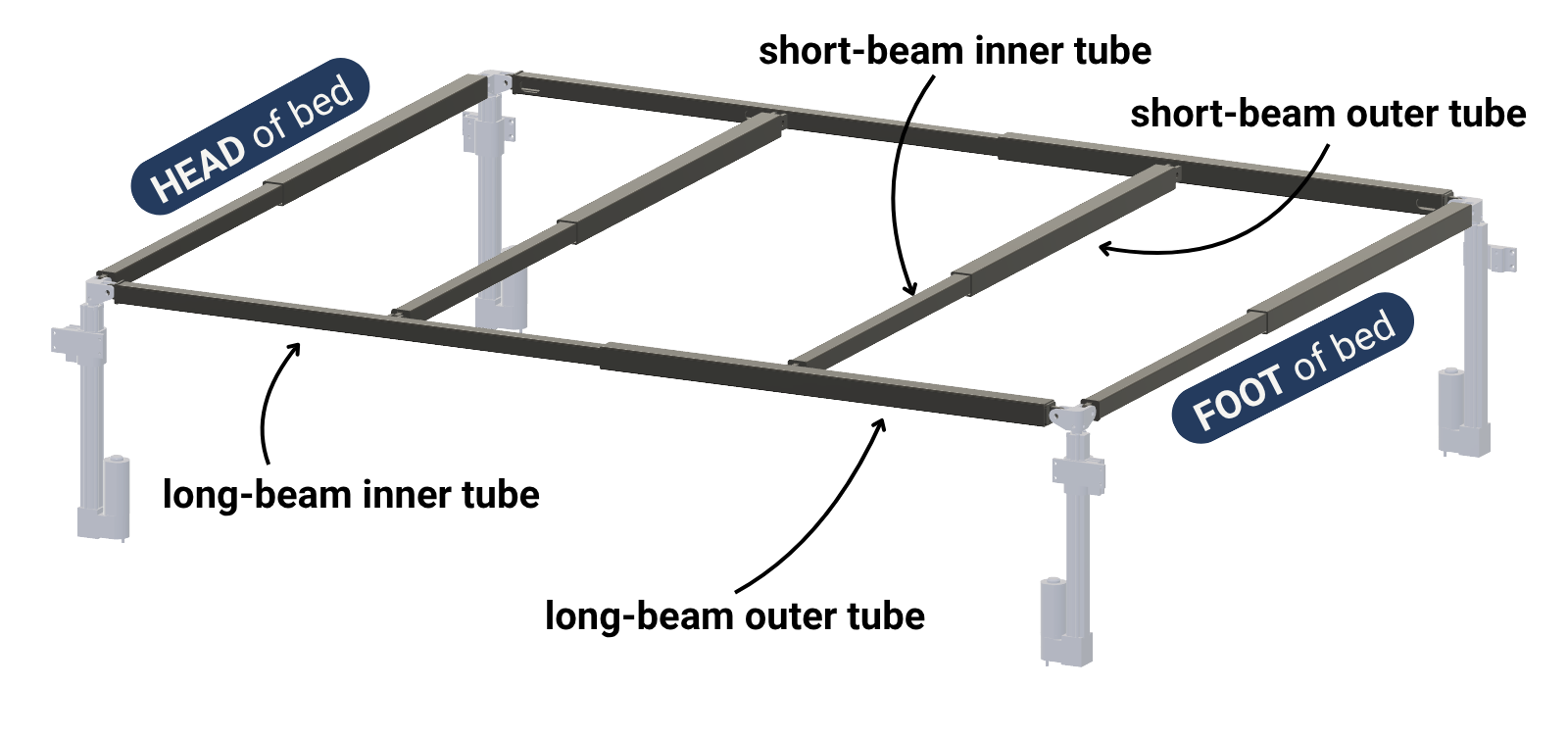 - Long-beam inner tubes -- point toward the HEAD of the bed