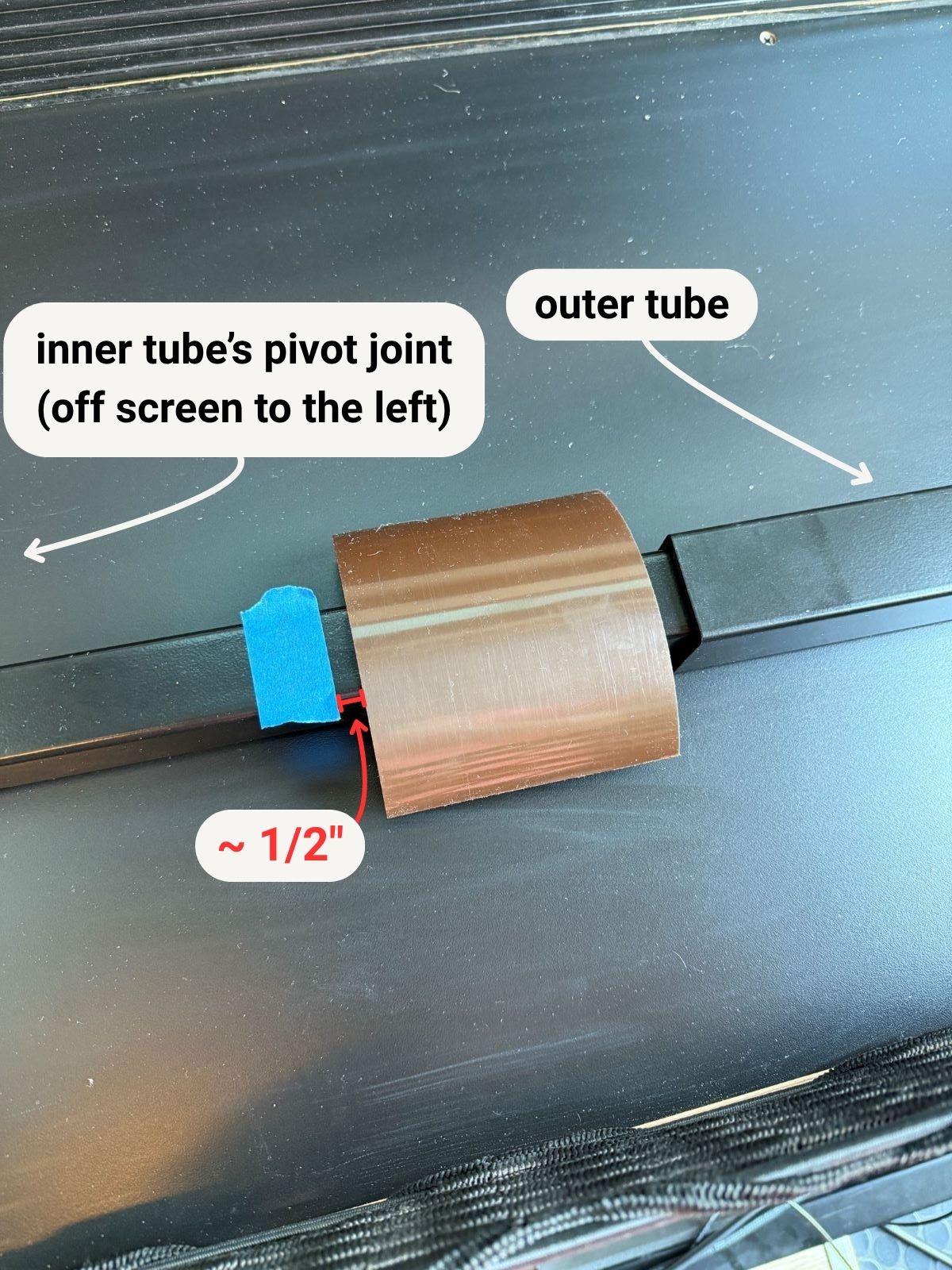 Apply the large glide tape about 1/2" away from the mark, on the side opposite the inner tube's pivot joint (this is the side where the outer tube will slide back on).
