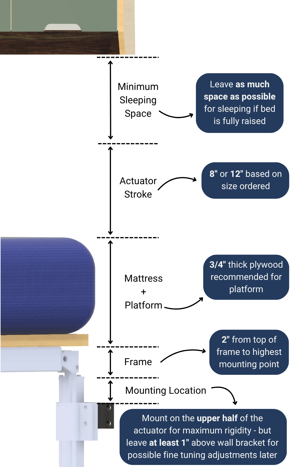 Ensure there is enough space above the wall bracket mounting height to allow for the frame, platform, mattress, actuator stroke length, and additional space for sleeping when the bed is fully raised.